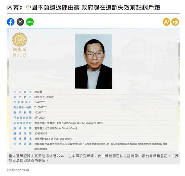 重大通緝犯陳由豪潛逃海外近22年,在中國設有戶籍,我主管機關已依法註銷陳由豪台灣戶籍登記。(擷取自法務部調查局網站)
