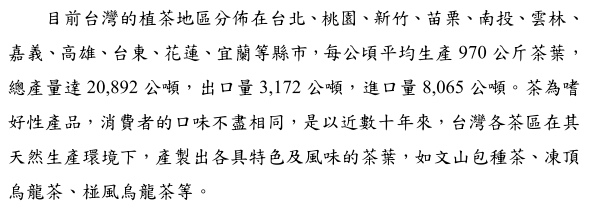 農糧署分析,台灣手搖杯及瓶裝茶市場所需的紅茶與綠茶數量很大,但因台灣紅茶與綠茶產量相對較少,因而增加國外紅茶與綠茶的進口量。