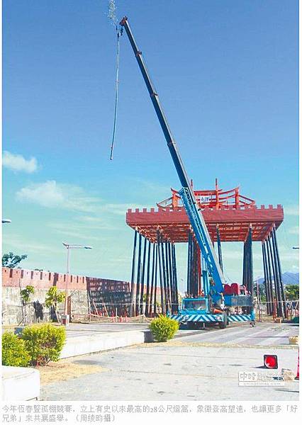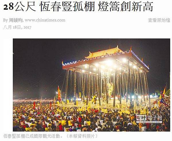 今年恆春豎孤棚競賽,立上有史以來最高的28公尺燈篙,象徵登高望遠,也讓更多「好兄弟」來共襄盛舉。(周綾昀攝)