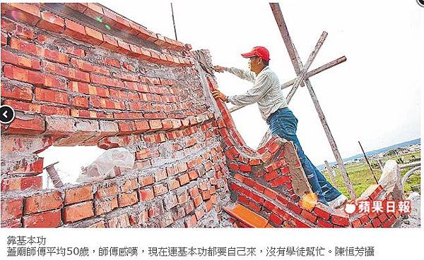 蓋廟師傅平均50歲,師傅感嘆,現在連基本功都要自己來,沒有學徒幫忙。陳恒芳攝