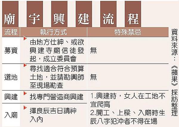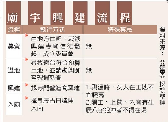 興建廟宇超過20年的營造商蕭瑞昇表示,地坪約30∼60坪的中小型寺廟最常見,興建成本要價千萬元以上,若佔地達一定規模,還會另外興建牌樓以吸引信眾目光,造價約200∼300萬元,工期8個月內可完工。