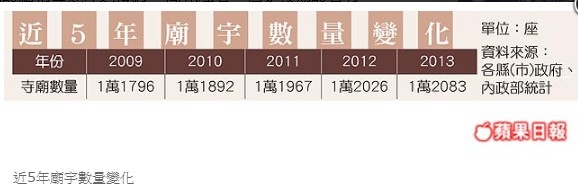 內政部統計資料顯示,截至99年底止,國內登記有案寺廟計1萬1875座,近10年來增加2438座;按宗教別來分,以道教占78.3%最多,佛教占19.6%次之。