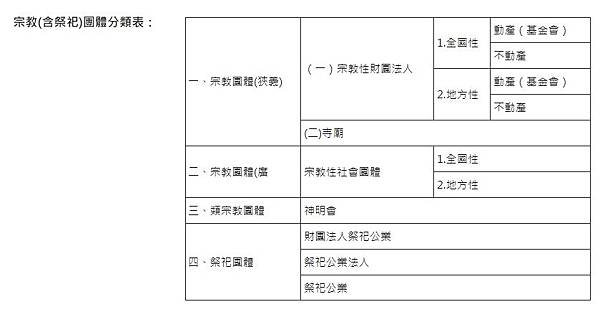 目前我國宗教團體的組織型態主要有「財團法人」、「寺廟」與「社會團體」3種: