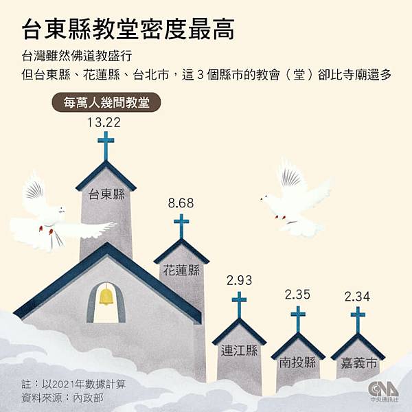 台東教會(堂)的密度則是全國最高,每萬人就有13.22間。