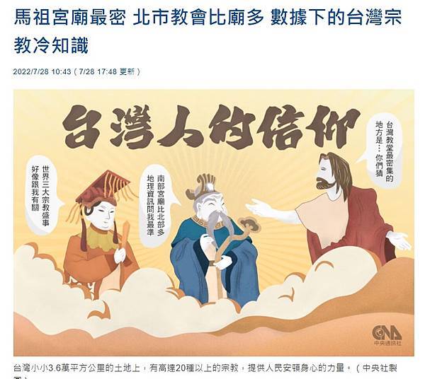 2022/7/28 10:43(7/28 17:48 更新)馬祖宮廟最密 北市教會比廟多 數據下的台灣宗教冷知識 | 生活 | 中央社 CNA https://bit.ly/3oDdzar