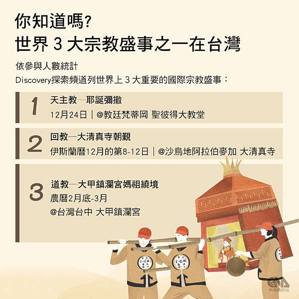 而Discovery探索頻道依參與人數,將超過百萬人參與的宗教活動列為世界上三大的國際宗教盛事:天主教─教廷梵蒂岡的耶誕彌撒、回教─沙烏地阿拉伯麥加的朝覲之行、道教─台灣台中大甲鎮瀾宮媽祖繞境。(編輯:邱柏綱)1110728 馬祖宮廟最密 北市教會比廟多 數據下的台灣宗教冷知識 | 生活 | 中央社 CNA