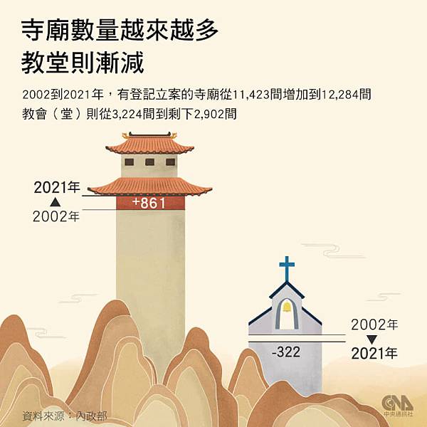 2002到2021年,登記立案的寺廟從11,423間增加到12,284間。不過,教會(堂)則從3,224間到剩下2,902間。