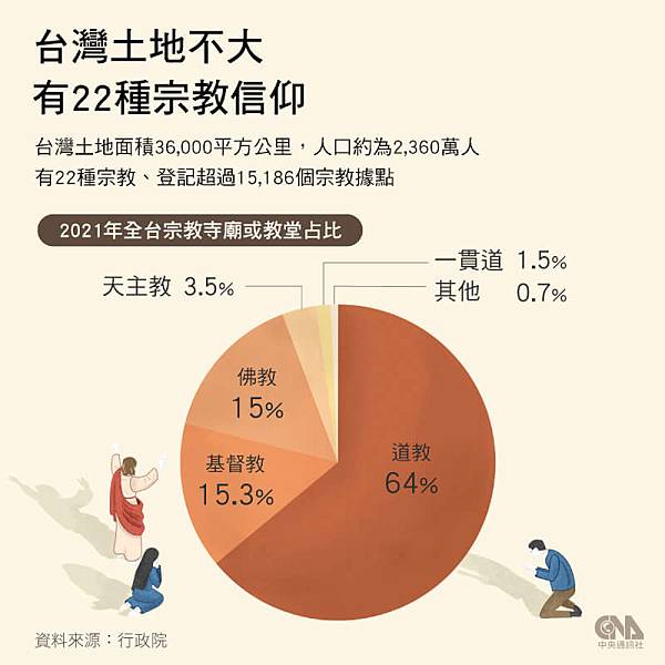 台灣小小3.6萬平方公里的土地上,有高達20種以上的宗教,提供人民安頓身心的力量。(中央社製圖)
