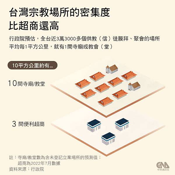 根據行政院估算,全台立案及未立案宗教場所有3萬3000多個;2022年全台超商則約1萬2000家。