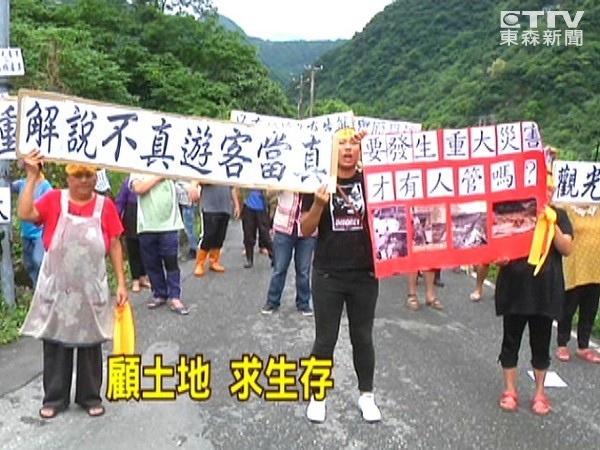 日前還有人開名車載家人前往「慕谷慕魚」,在溪裡玩水時叼著菸,亂丟寶特瓶和菸蒂,遭另一名遊客勸阻時還嗆說「來玩就是要爽!」觀光帶來破壞也讓銅門部落民眾痛心地說,慕谷慕魚是太魯閣族的祖靈安息地,不是觀光勝地,7日身穿傳統服飾,在歐菲莉風災紀念碑前拉起白布條,高喊「車輛後退、捍衛原基法、護土地、求生存」(下圖)。