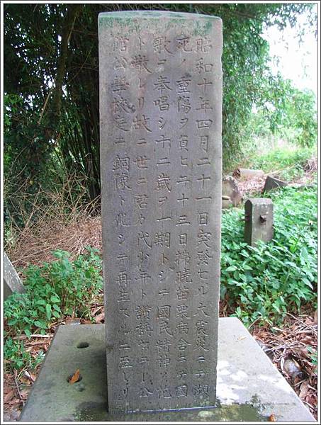 (譯文:在昭和10年4月21日突然發生的大地震中身負重傷,23日清晨在苗栗病房彌留之際吟唱國歌後結束其12歲的人生,此猶如國民精神之花凋落,因而被世人讚頌為「國歌少年」,並化身為銅像豎立在公館公學校的校園。)
