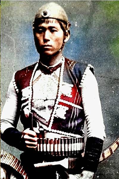 頭載藤帽,腰部繫有彈袋,似乎是說明了槍隻取代了傳統的矛與弓箭。https://www.facebook.com/groups/343941065730870/permalink/3173455419446073/