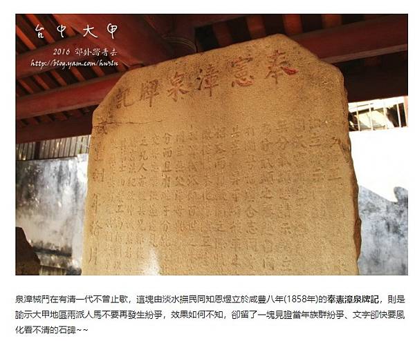 泉漳械鬥在有清一代不曾止歇,這塊由淡水撫民同知恩煜立於咸豐八年(1858年)的奉憲漳泉牌記,則是諭示大甲地區兩派人馬不要再發生紛爭,效果如何不知,卻留了一塊見證當年族群紛爭、文字卻快要風化看不清的石碑~~