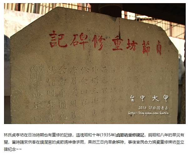 林氏貞孝坊在日治時期也有重修的記錄,這塊昭和十年(1935年)貞節坊重修碑記,與昭和八年的旱災有關,當時請來供奉在鎮瀾宮的貞節媽神像求雨,果然三日內旱象解除,事後官民合力捐資重修牌坊並立碑紀念~~