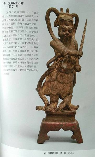 《三教搜神大全》記載,趙公明是終南山人。自秦朝即避世於山中,漢朝道教正一道張道陵天師在鶴鳴山精修時,收他為徒。且讓他騎黑虎,守護丹室。張天師煉丹功成後,分丹與趙公明食之,趙因而得道,成為守護正一道的「正一玄壇真君」。趙公明神異多能,變化無窮,能夠驅雷役電,呼風喚雨,更能為信徒保命解災,道教所有宗派都視為重要護法神,四大元帥之一。《封神演義》中,武王克殷時,趙公明輔助殷商而陣亡,被封為玄壇真君。