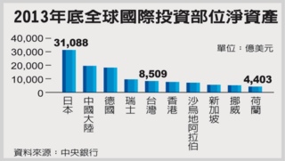 中央銀行指出,去年國對外資產總額1兆4379億美元,負債總額為5870億美元,兩者互抵後,國際投資部位淨資產達8509億美元,創新高,蟬連全球第5大淨債權國。