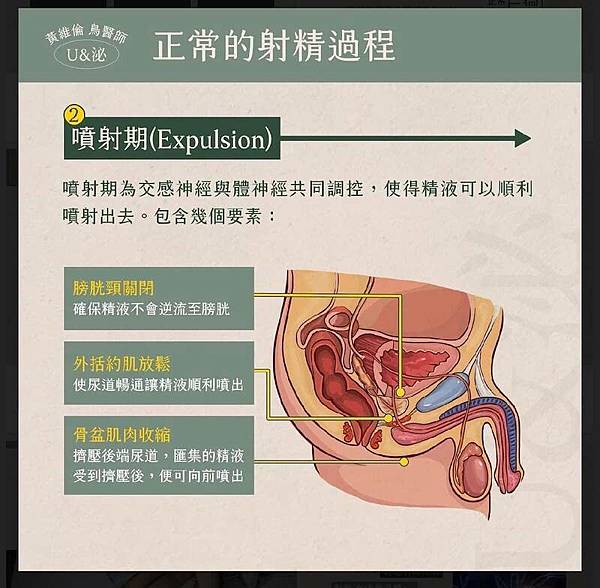 ●噴射期(Expulsion):噴射期為交感神經與體神經共同調控,使得精液可以順利噴射出去。其中,包含幾個要素,膀胱頸關閉(確保射精時精液不會逆流至膀胱)、骨盆肌肉收縮(擠壓後端尿道,匯集的精液受到擠壓後便可向前噴出)及外括約肌放鬆(使尿道暢通讓精液順利噴出)。