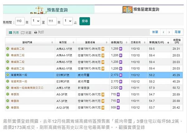 最新實價登錄揭露,去年12月桃園青埔高鐵特區預售案「威均帝璽」3樓住宅以每坪58.2萬、總價2173萬成交,刷新高鐵特區有史以來住宅最高單價。。翻攝實價登錄