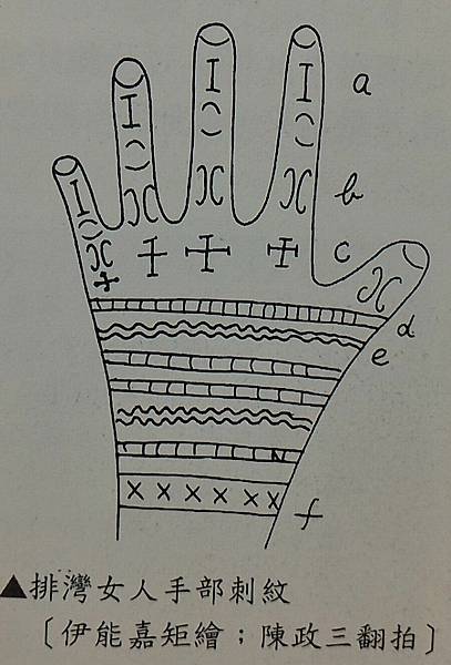 手背上主要刺傳統領域(家族所擁有的山林、河川、道路等)、靠近手腕之處刺上象徵祖先的百步蛇菱形文樣。