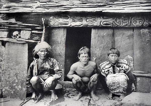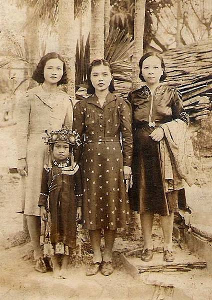 日治時代哦卡桑和友人在屏東公園三地門石板屋前留影,前面盛裝者是排灣族小姑娘有料(收費)陪照。
