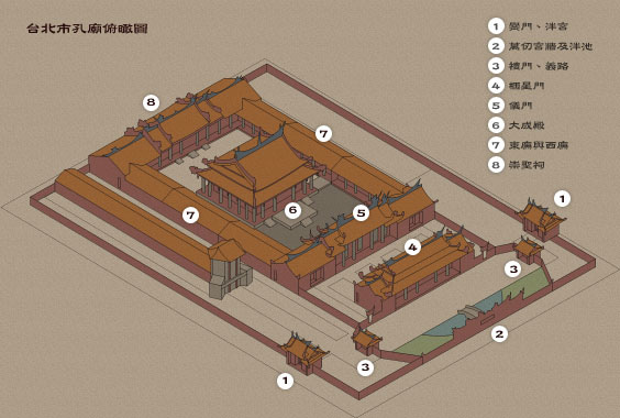 北市孔廟指出,孔廟佈局依序為萬仞宮牆、泮池、櫺星門、儀門、大成殿及崇聖祠。孔子集大成於一身,被尊稱為「大成至聖先師」,因此祀奉孔子牌位的主殿稱為大成殿。其他如禮門、義路、崇聖祠等,都有明確的意義和內容,並且都是以道德倫理禮樂教化為中心命名。