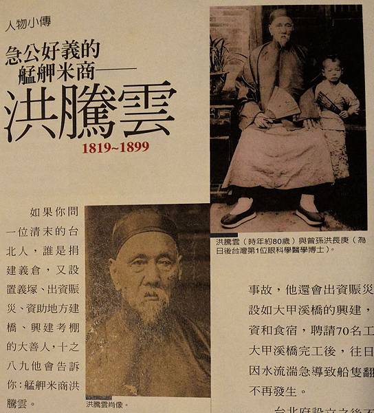 洪騰雲,福建泉州晉江人,洪騰雲幼年隨父親來台定居艋舺(萬華),成年後從事米郊生意,與泉廈貿易往來而致富,平時樂善好施,興建義倉,設置義塚,為當代善人。