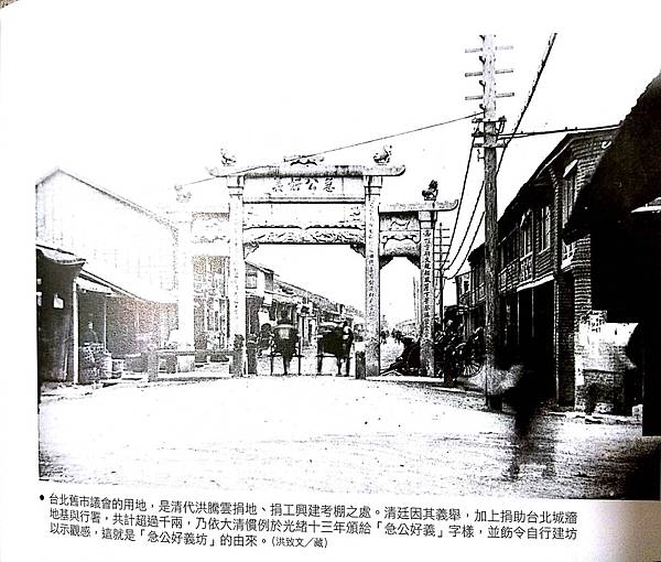 洪騰雲急功好義入口牌坊1888年最早在台北城中心位置(大約位在今重慶南路與衡陽路口),1905年遷移在台北市的228紀念公園