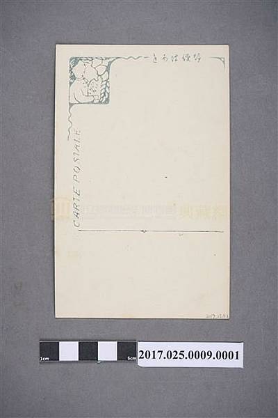 2.明信片背面印刷「郵便はがき CARTE POSTALE」,左上角郵票處為一個人側坐手拿物體,右邊有類似葉子之裝飾。其餘部分皆空白。