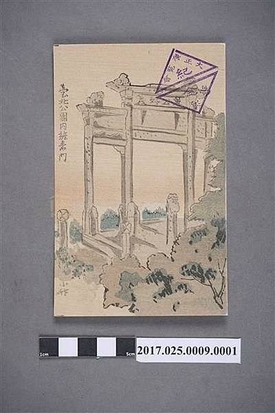 1.此文物是以台北公園內的急公好義坊為主題的明信片,以彩色繪圖呈現。彩繪景緻除了急公好義坊外,還繪製了幾棵樹,左上角寫有「臺北公園內旌寿門」,下寫有小竹。右上角蓋有大正博覽會台灣館紀念章,以兩個三角形上下對稱為圖形。