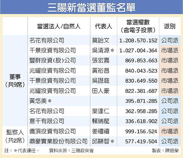 而公司派取得董事席次有三陽現任董事長黃悠美(0.98億權)、明花有限公司代表人莫詒文(0.65億權)、明花有限公司代表人葉達仁(0.65億權)、意千有限公司代表人賴瑞龍(0.39億權),取得1席監察人為鼎豪實業股份有限公司代表人邱顯智。