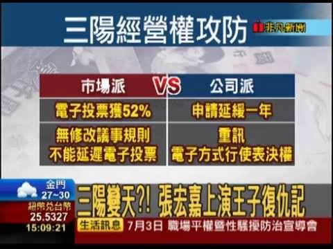 據了解,市場派將推派張宏嘉出任三陽董事長,張宏嘉的父親張國安是三陽創辦人之一,張家因故退出後,另一創辦人黃繼俊家族就此掌控全局,黃悠美為第三代接班人;張、黃競逐經營權,被稱為「王子與公主的戰爭」,張宏嘉與市場派結合拿回主導權,並重返董事會,真實上演「王子復仇記」。