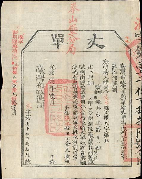 清代臺灣文獻:(1888年)光緒14年臺灣布政使司淡水縣拳山里清潭庄《丈單》(31.5*25cm)一件,完整清晰,蓋紅色『拳山堡分局』『福建臺灣府政使司關防』,摺痕,85新 註1:丈單即土地所有權狀,也做為收糧的依據,丈單有兩種,一種是佃戶將土地墾成後,業主清丈土地,給發佃人之單據,以定佃戶所應繳納之租穀;另一種是光緒年間劉銘傳進行清賦事業,清丈土地後發給業主的土地單據,主要作為政府課稅之依據,此種丈單在土地買賣時要併同移轉 註2:1875年臺北府淡水縣拳山堡,1894年拳山堡更名為文山堡,日治時期1895年隸屬臺北縣文山堡,1909年改隸臺北廳新店支廳,此地現為新店區青潭一帶