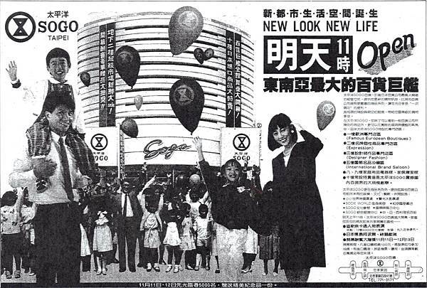 1987年11月10 日《自立晚報》頭版刊登的「太平洋崇光百貨台北忠孝館」開幕廣告(謝謝網友陳致學分享)