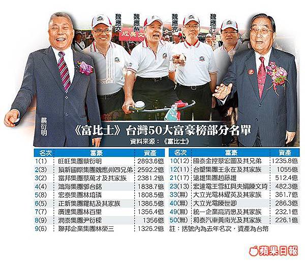 最新的台灣富豪榜前十名變動不大,蔡衍明資產和去年相比雖縮水了三百億元台幣,仍以近三千億台幣坐穩首富寶座。頂新魏家四兄弟掌握康師傅、味全、德克士炸雞等品牌,加上中國房地產、台北一○一股權等投資,升至第二。富邦蔡萬才家族身家微幅縮水六十億元台幣,排名第三。鴻海集團總裁郭台銘第四。