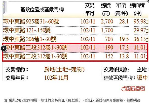 實價網出現2筆同樓層、地址的交易資訊(紅框處),投訴人質疑被仲介賺價差。翻攝網路