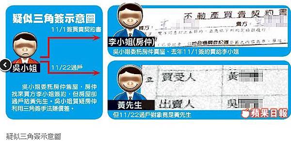 吳小姐向《蘋果》投訴全國不動產中壢中原加盟店業務王寶傑,利用三角簽手法,將房屋轉賣給第三人。所謂的「三角簽」,是指屋主甲委託房仲售屋,房仲找來買方乙,但最後卻是將房屋過戶給第三人丙。類似的賣屋手法,中間買方乙可省下賣屋稅費及奢侈稅;甚至有房仲自導自演,找人頭戶當買方,大賺價差。