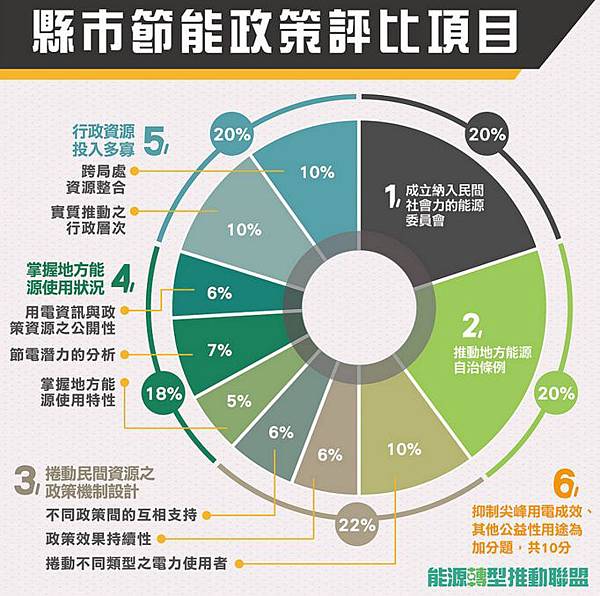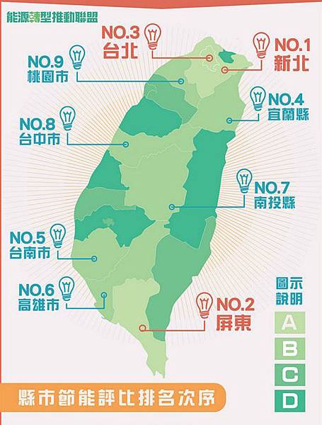 台灣面臨能源轉型的重要關頭,政府終於動起來,行政院大刀闊斧投入30億元,提出「自己的電自己省」縣市節電計畫。民間團體自主成立「能源轉型推動聯盟」監督各縣市的節能政策,並於今(27日)公布評比成績。新北市、屏東縣、台北市列表現最好的前三名,而基隆市、苗栗縣、彰化縣、嘉義縣、花蓮縣則被列為有待加強。