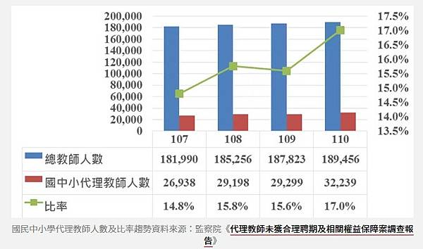 他說,曾經調查過,代理教師比例達15%,偏鄉甚至高達20%,換句話說就是5名老師就有1人是代理教師,台中還是都,狀況還算好,其他偏遠地區的情況可能更嚴重。