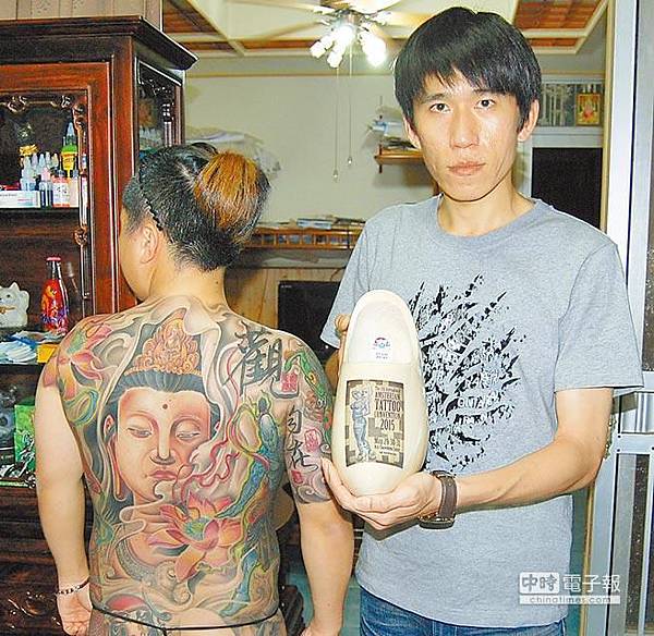 紋身師丁碩毅(右)創作《觀自在》觀音佛像,榮獲今年荷蘭阿姆斯特丹紋身展最佳東方圖第一名。(廖素慧攝)