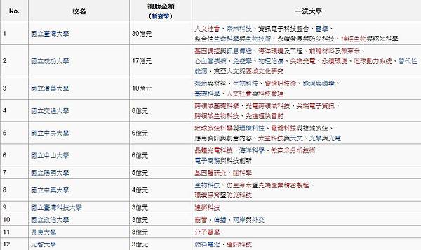 頂尖大學計畫執行期間自2011年起至2015年止,並於2011年4月1日公布審議結果,共計12所大學包括34個研究中心獲得補助,各校依獲得補助之規模排序依次為:國立台灣大學、國立成功大學、國立清華大學、國立交通大學、國立中央大學、國立中山大學、國立陽明大學、國立中興大學、長庚大學、國立政治大學、國立臺灣科技大學、元智大學。