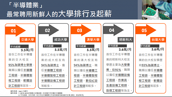 結果顯示,半導體業最常聘用新鮮人,前五名依序為:交通大學、成功大學、清華大學、明新科大、台灣大學;台清交成平均起薪5.5萬,逾9成為碩博士學歷,多擔任半導體、軟體工程師,明新科大則為3.6萬,多為大學學歷,職務除半導體設備工程師外,也包括作業員、生產設備工程師等。