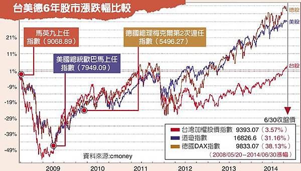 台股自5月起驚驚漲,6月更大漲317.16點,但將時間拉長,台股自馬總統2008年上任以來,歷經金融海嘯、歐債危機等,一路往下,儘管近期漲翻天,但台股從2008年520之後到今年6月底,指數從9068.89點,漲到9393.07點,不過漲了3.57%,美國股市的漲幅將近台股漲幅9倍,德國股市漲幅更是台股漲幅的10倍。