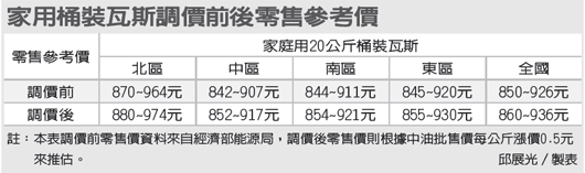 液化石油氣類產品包括家用液化石油氣(桶裝瓦斯)、工業用丙烷、丁烷、混合丙丁烷,每公斤各調漲0.5元;車用液化石油氣每公升調漲0.2元。