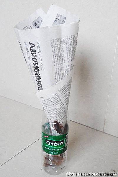 (選礦泉水瓶的時候要選材質硬的,像怡寶、農夫山泉都可以,康師傅純淨水、冰露純淨水的環保瓶太軟,瓶口容易變形,報紙塞不緊,蟑螂會從這裡爬出來。)