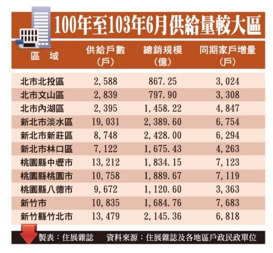 (以下各區供給量為預售及新成屋加總。預售屋現階段未興建完工,但以一般施工期估算,兩、三年前推的預售屋,如由轉手套利型投資者購買,完工後仍將重新釋出,對該時段市場供需及價格產生影響;以此類推,現在推出的預售屋,也會在兩到三年後造成類似情況)