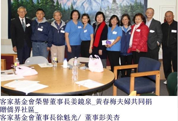 姜鏡泉、黃春梅夫婦-美國客家基金會榮譽董事長,因為共同捐贈一座價值五百萬美元的大樓捐出,做為成立洛杉磯僑社第一個客家會館之用,同時提供一百萬美元現金做為內部裝設之需。供洛杉磯僑界裝設客家會館,獲中國國民黨頒贈華夏三等獎章與獎狀表揚。 @ 姜朝鳳宗族 :: 痞客邦 PIXNET :: - http://goo.gl/Paxjj2