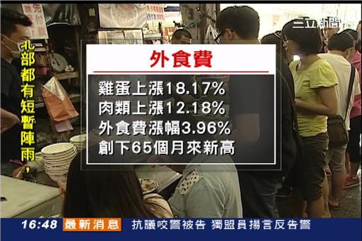 行政院主計總處今天發布6月消費者物價指數(CPI)為104.44,年增1.64%,其中外食費漲3.96%,創下民國98年2月以來、近65個月最高,每月增加支出約新台幣239元。