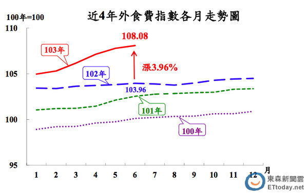 蔡鈺泰也表示,外食費價格不僅連續上漲,漲幅也創近5年多以來的新高,而且外食費大多漲了就跌不回去,觀察近4年來各月的外食費走勢,就完全沒有重疊的部分,顯示外食費沒有回跌過,且長期趨勢向上,未來漲幅仍有機會超過3%。