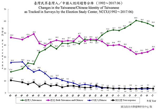 公告:臺灣民眾臺灣人/中國人認同趨勢分佈(1992年06月~2017年06月) - 政治大學 選舉研究中心 - https://goo.gl/vYgQ9S