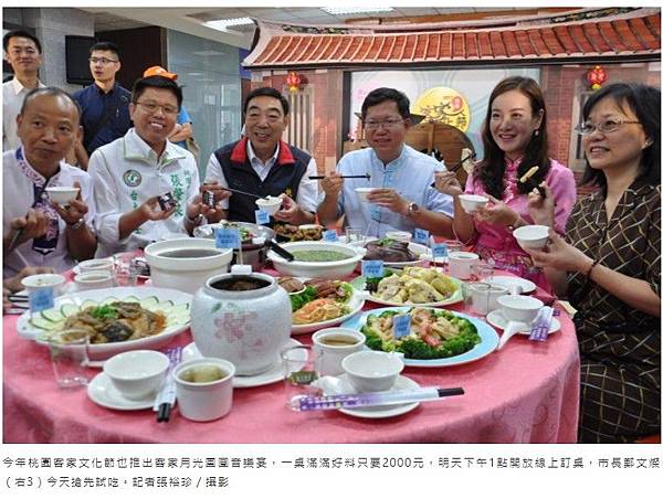 今年桃園客家文化節也推出客家月光團圓音樂宴,一桌滿滿好料只要2000元,明天下午1點開放線上訂桌,市長鄭文燦(右3)今天搶先試吃。記者張裕珍/攝影